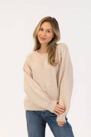 Feminine and cozy, this soft beige eco sweater is adorned with delicate pearl bow details for a charming touch. Its relaxed fit and timeless crew neckline make it a versatile piece to dress up or keep casual. Perfect for adding elegance to your everyday wardrobe.