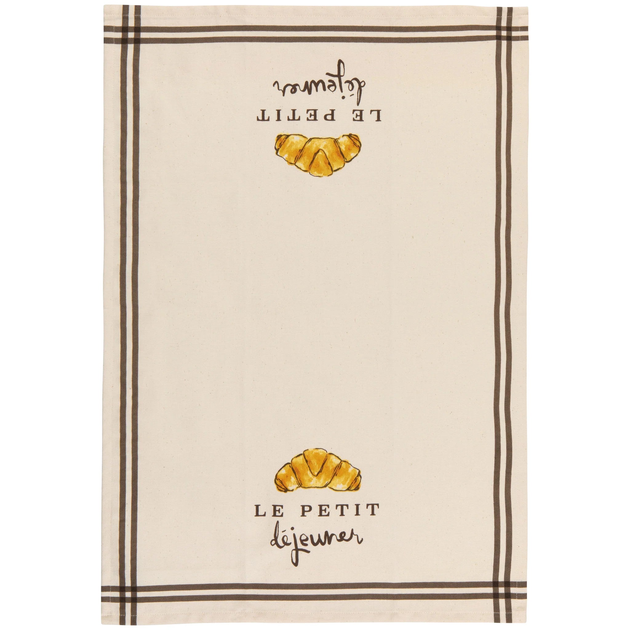 Add life and character to your kitchen with our fun and colorful printed and woven cotton Le Petit Dejeuner dishtowel. A perfect combination of form and function, this towel will make washing up less of a chore. Begin the day with a très chic breakfast: a buttery, flaky croissant and a strong espresso. This iconic crescent-shaped pastry brings the charm of a Parisian café to any kitchen.