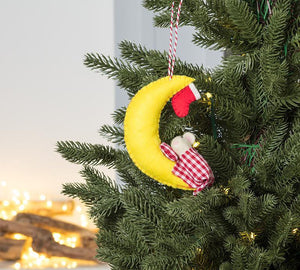 This little Baby Mouse on Moon Ornament is a delightful addition to any Christmas tree. Nestled comfortably on a yellow crescent moon, this sweet plush ornament features a sleepy mouse under a gingham blanket, complete with a hanging stocking, to help sweeten your dreams and your holiday decor. Other holiday ornaments also available.