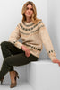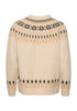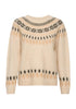 Knitted sweater with a straight fit, featuring a round neckline and long sleeves. Textured soft finish with contrasting geometric pattern across yoke, hem and cuffs.